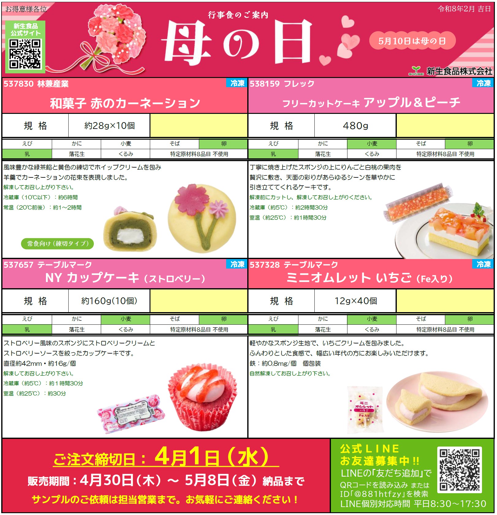 母の日向け商品には、カーネーションを表現した和菓子やりんごと白桃を使用した華やかなケーキもご用意しております!